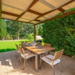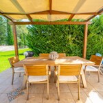 A BBQ and outside dining area add to this already perfect setting in private established gardens. The villa has one twin bedded bedroom and two doubles, two bathrooms made up of one family bathroom downstairs and a bathroom with shower upstairs.